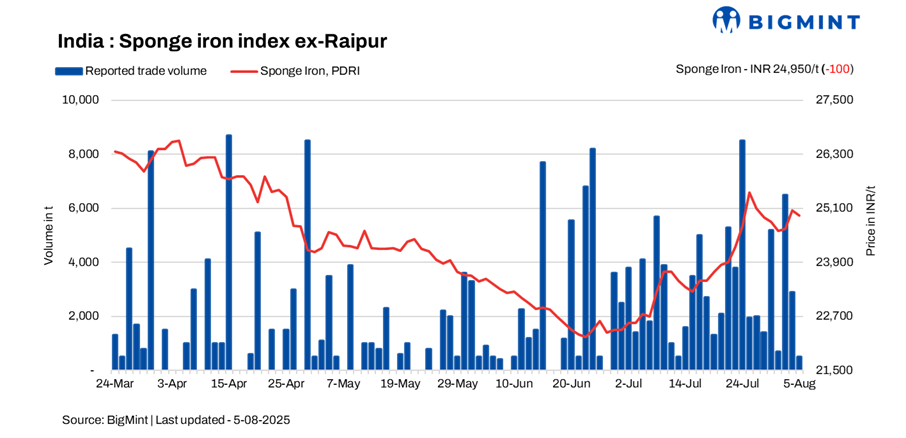 Sponge iron spot prices in India fell by INR 100-400/t on 5 August 2025, with the steepest drop of INR 300-400/t recorded in Durgapur, driven by weak demand and limited trading activity. Similar price corrections were reported in Raipur, Ramgarh, Raigarh, and Durgapur, reflecting an overall bearish market tone.