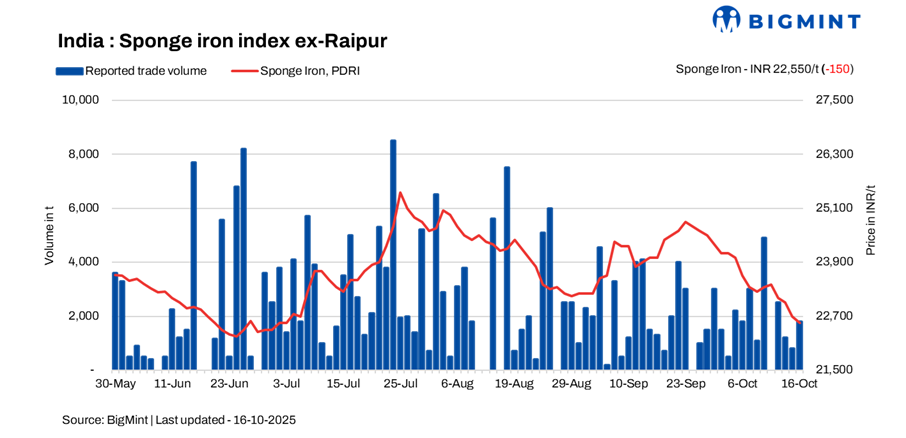 Indian sponge iron prices declined d-o-d in most regions on 16 October 2025. Prices dropped by INR 50-300/tonne (t) in most regions due to weak sentiment and sluggish demand, while Raigarh stood out with a price increase of INR 100/t, supported by regional demand and supply constraints. The sharpest correction was seen in Chennai, where prices plunged by INR 300/t amid poor buying interest and slow downstream activity.