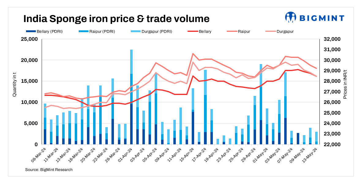 Sponge iron prices in all key domestic markets dropped in the range of INR 50-550/tonne (t) on 13 May, 2024 due to soft steel demand.