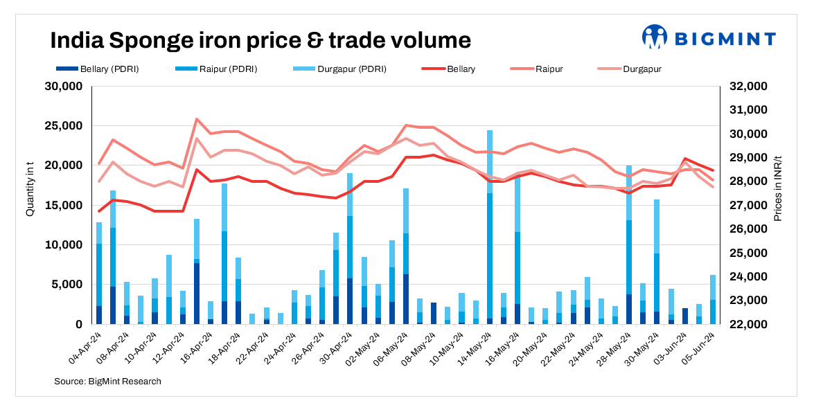 Sponge iron prices in all key domestic markets dropped in the range of INR 200-650/tonne (t) on 5 June, 2024 due to soft steel demand.