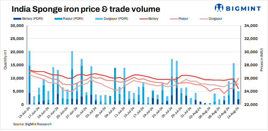 Only 6,650 t of sponge iron transactions were recorded in the country on Wednesday compared to 20,200 t on 13 August.