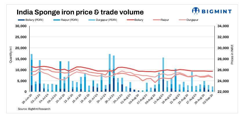 Sponge iron prices decreased today in the range of INR 100-300/t across regions due to weak demand and prevailing bearish market sentiments. Despite lower offers in the spot market, buyers opted to wait and watch, as sentiments in the finished steel segment remained less than supportive.