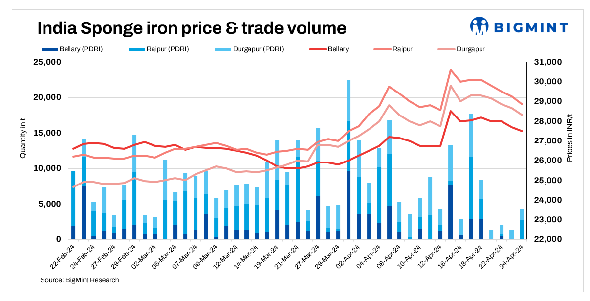 Around 4,600 tonnes (t) of sponge iron transactions were recorded in the country on Wednesday compared to 5,100 t on 23 April.