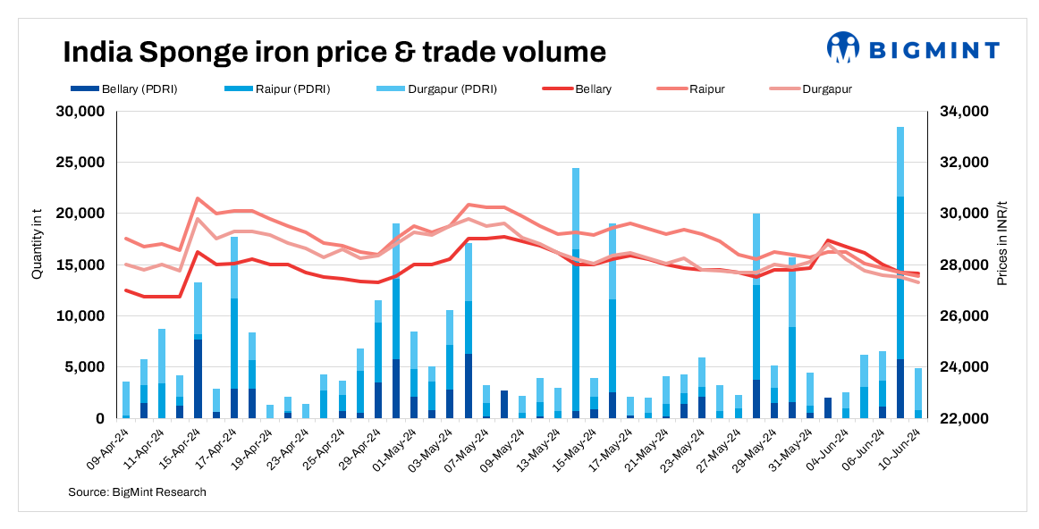 Sponge iron prices in all key domestic markets dropped in the range of INR 50-500/tonne (t) due to falling steel prices.