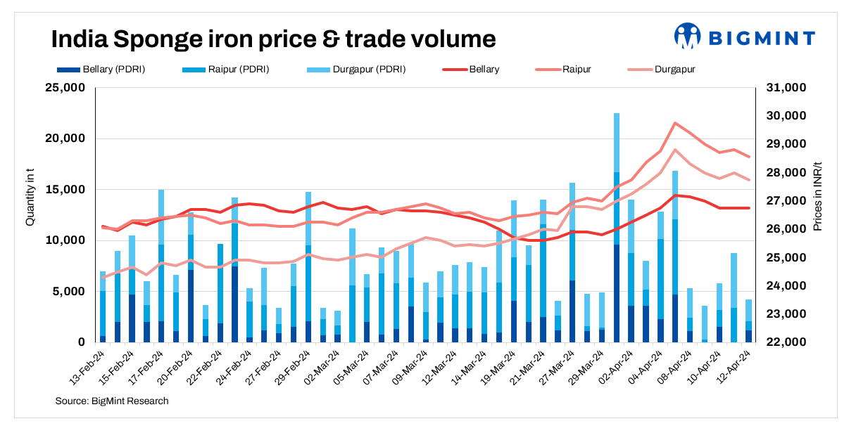 Sponge iron prices in all key domestic markets dropped in the range of INR 100-450/tonne (t) due to falling steel prices.