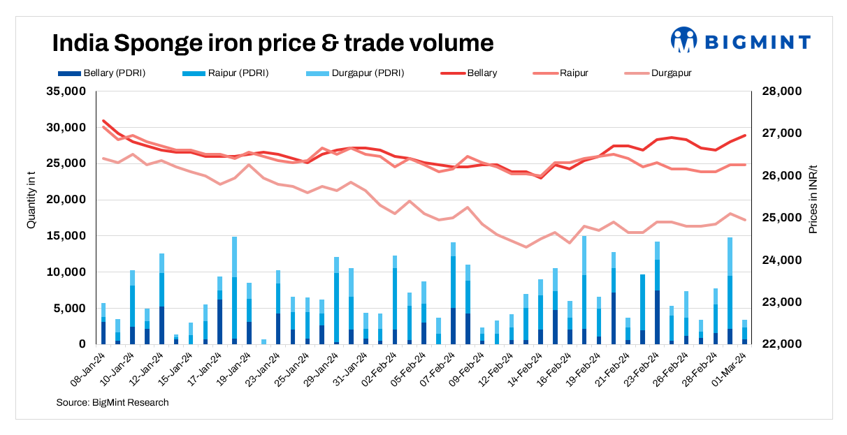 PDRI prices closed at a range of INR 24,900-27,700/t and CDRI prices at INR 26,300-31,200/t.