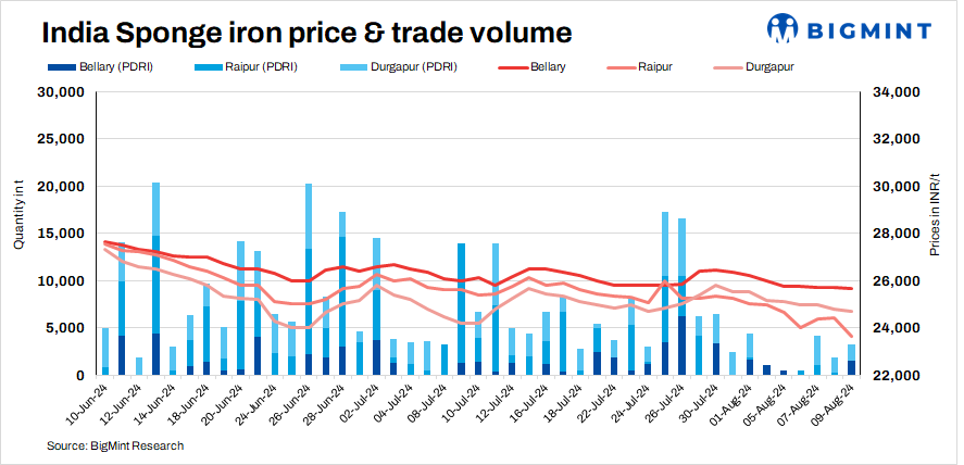 Prices continued to fall as buying activity remained modest: only 6,500 t of sponge iron transactions were recorded today compared to 3,000 t on 8 August.