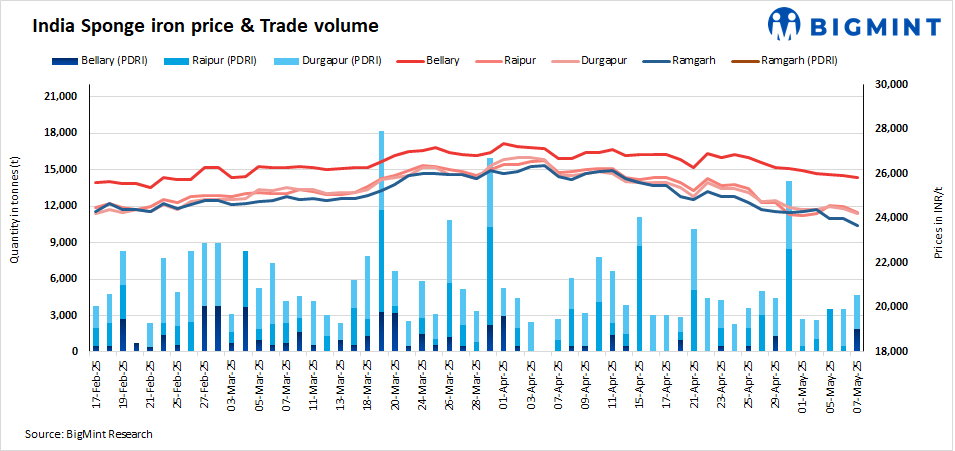 Buyer caution prevailed in a declining market, resulting in modest transaction volumes. Only 6,800 t of sponge iron transactions were recorded in the country today.