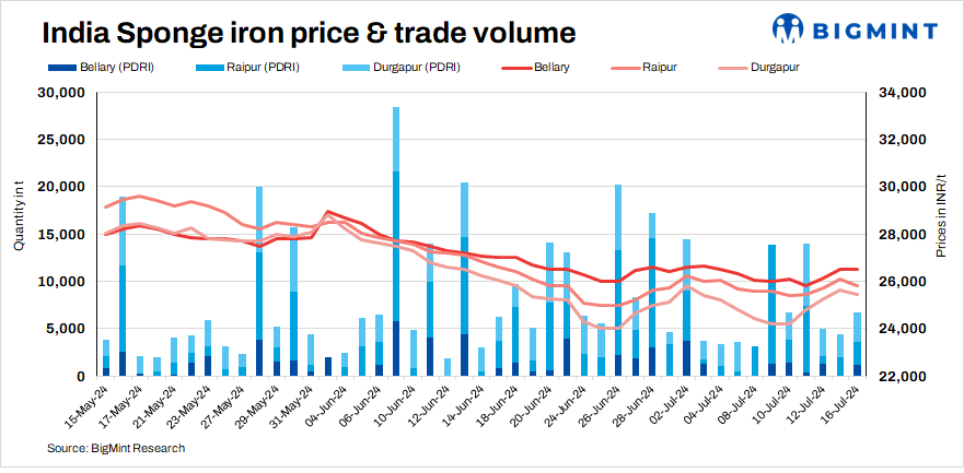 Only 9,650 tonnes (t) of sponge iron transactions were recorded in the country compared to 11,000 t on 15 July.