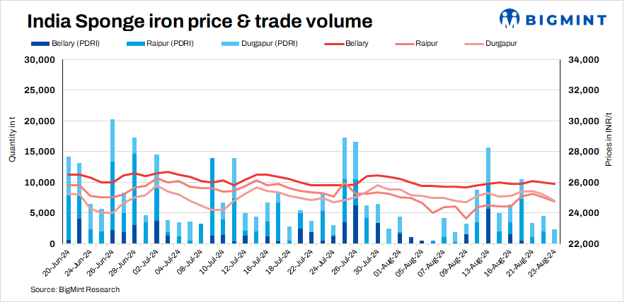 Only 4,500 t of sponge iron transactions were recorded in the country compared to 6,300 t on 22 August.