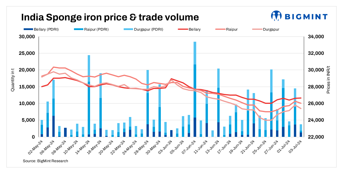 Only 7,360 tonnes (t) of sponge iron transactions were recorded in the country compared to 28,610 t on 2 July.