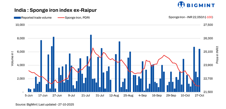 Sponge iron prices across India declined by INR 50-300/tonne (t) d-o-d on 27 October 2025, as weak market sentiment persisted. However, lower offers encouraged improved trading activity, particularly in the latter half of the session, providing temporary support to overall demand.