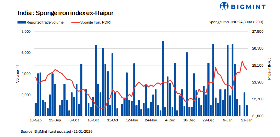 India’s sponge iron (DRI) prices eased by INR 100–400/tonne (t) d-o-d across regions on 21 January 2026, mainly due to limited buying interest. Market participants indicated that sellers were largely focused on dispatching previously booked material, resulting in no notable selling pressure in the spot market. On the raw material front, prices also corrected amid dull buying activity. Overall procurement remained confined to immediate requirements, with buyers continuing to adopt a cautious, wait-and-watch approach.