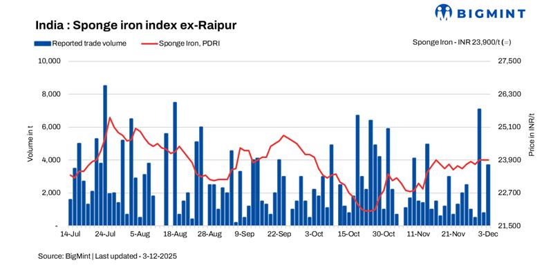 Sponge iron prices across India increased by INR 100-200/tonne (t) on 3 December 2025 supported by improved market sentiment and firmer offers from key producers. The Raigarh market saw the sharpest rise of INR 200/t driven by slightly stronger buying interest from billet manufacturers and strengthening raw material prices. Despite this uptick, the overall sponge iron market continued to trade within a largely range-bound pattern.