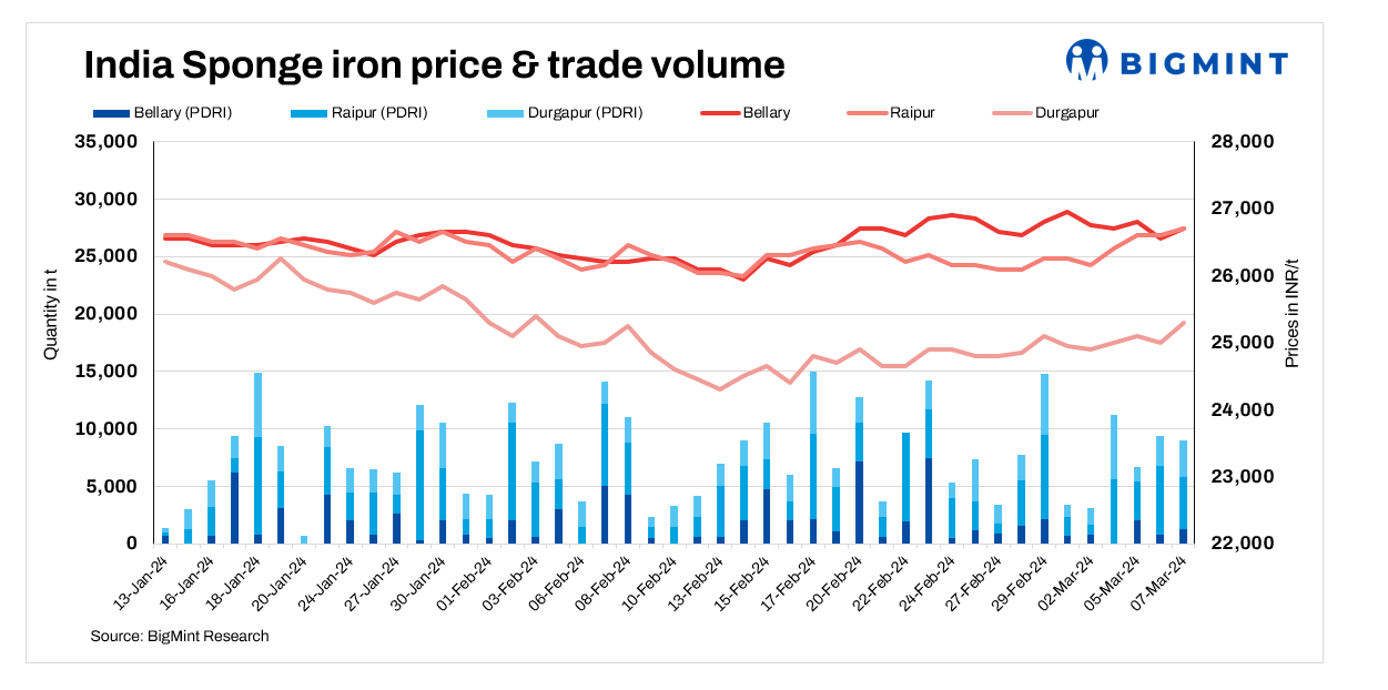 About 15,100 tonnes (t) of sponge iron transactions were recorded in the country on Thursday compared to 14,950 t on 6 March.