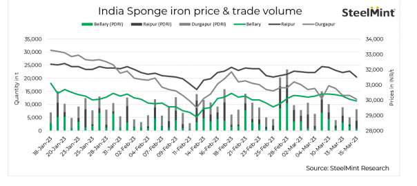 - Bellary: Weak demand weighed on sponge iron prices as the decline in semi-finished and finished steel demand had a substantial impact on sponge iron demand. As a result, trading volumes fell sharply.