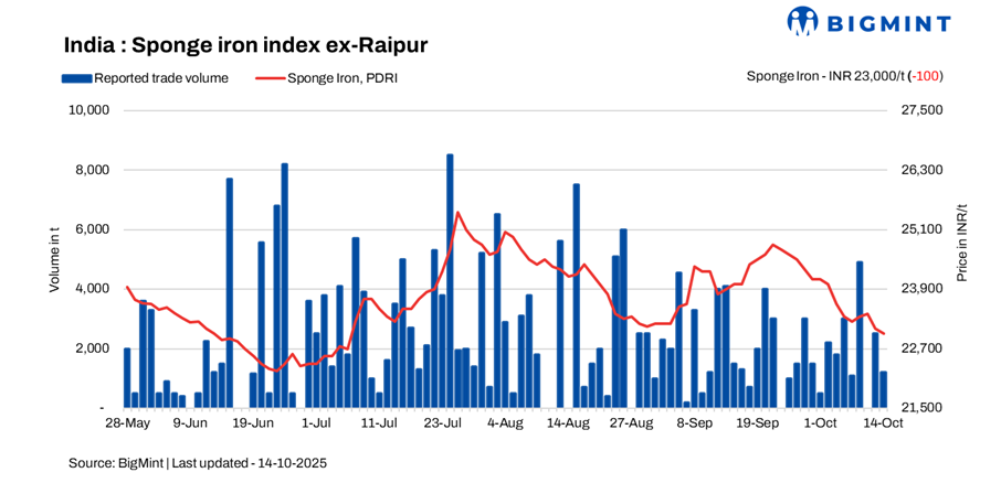 Sponge iron prices across India declined by INR 100-350/tonne on 14 October 2025, as weak demand and limited inquiries continued to pressure the market. Most trades were concluded at lower price levels, reflecting cautious buyer sentiment, while producers resisted deeper price cuts despite persistent selling pressure in key producing regions.