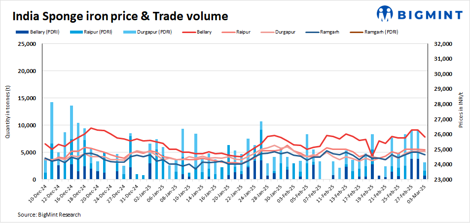 Indian sponge iron prices declined by INR 100-300/tonne (t) across major markets on 3 March, 2025.