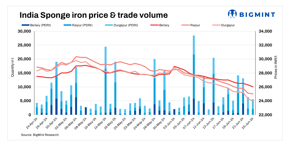 Sponge iron prices in all key domestic markets dropped in the range of INR 100-700/tonne (t) on 25 June, 2024 due to soft demand for steel.