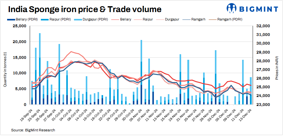 Despite a cautious market outlook, the recorded transaction volumes today remained at a moderate level.Transactions of 12,450 t of sponge iron were recorded in the country, up from 7,900 t on 12 December.