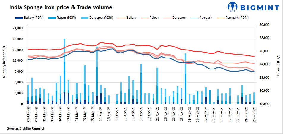 Transactions for only 6,300 t of sponge iron were recorded in the country today, compared to 4,200 t on 22 May.