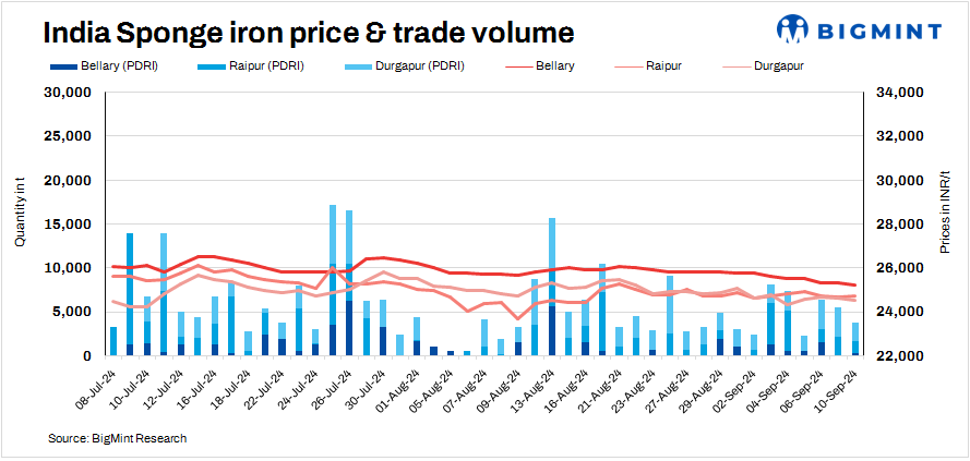 Only 6,950 t of sponge iron transactions were recorded in the country on Tuesday, compared to 7,600 t on 9 September.