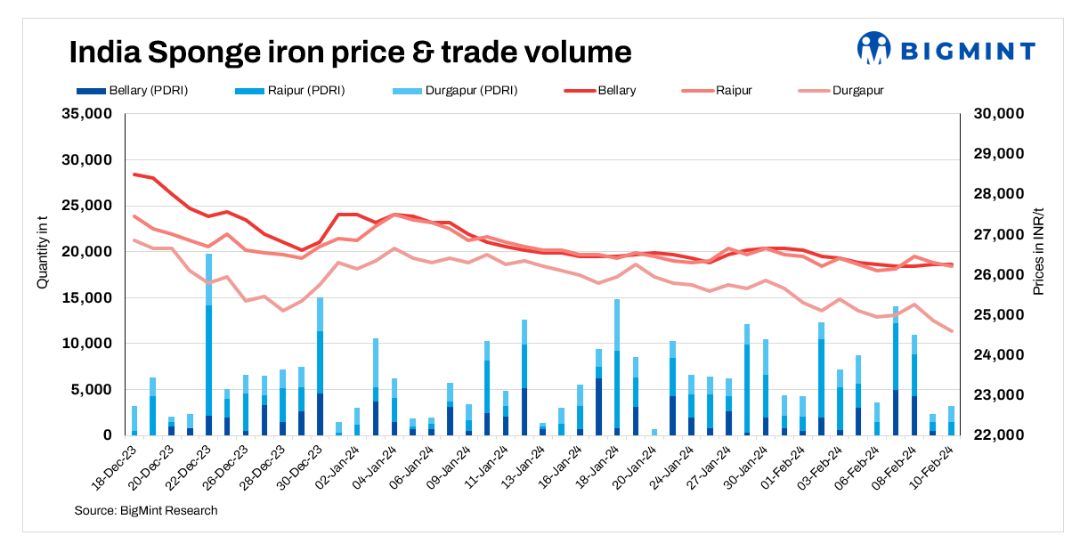 Sponge iron prices in India inched down further amid uncertain market conditions in key locations. Prices fell across the country by INR 50-250/t on 10 February, 2024.