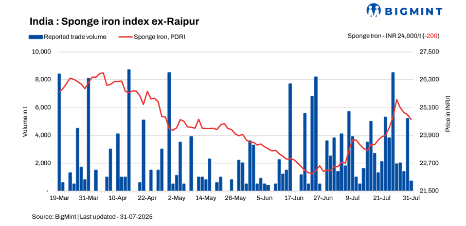The Indian sponge iron market witnessed a subdued trading session on 31 July 2025, with spot prices declining by INR 50-200/t across key producing regions. Raipur recorded the steepest price correction, driven by weak demand and minimal trading activity throughout the day.