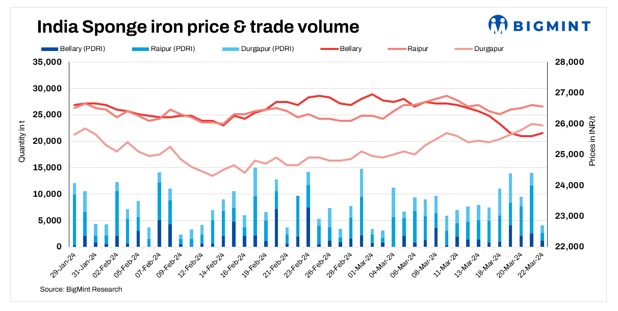 Sponge iron prices fell by INR 50-250/tonne (t) in some key locations across India on 22 March, 2024. However, sponge iron prices in Ramgarh, and southern region increased by INR 100-350/t.
