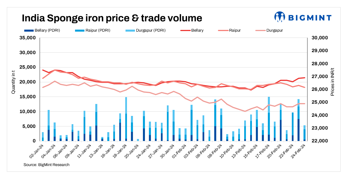 Sponge iron prices fell by INR 50-200/tonne (t) in some key locations across India on 24 February, 2024. However, sponge iron prices in Ramgarh, Durgapur and Bellary showed a marginal rise by INR 50-100/t.