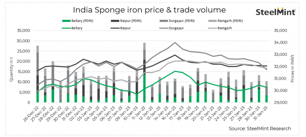 Indian sponge iron prices declined in the range of INR 50-550/t across major locations. Prices continued to fall in the northern and eastern regions of the country as spot trading activity remained limited. Suppliers faced selling pressure resulting in the continuous reduction in both offers and bids. Uncertain price swings, according to sources, impacted spot trade volumes.