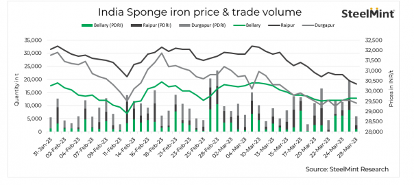 Prices of sponge iron decreased by INR 150-300/t in key locations today on falling steel prices. Spot trades remained just about moderate resulting in offers softening further. Market participants seemed to lack trust in the direction of prices. Despite the price reduction, buyers are still acquiring material to meet immediate requirements.