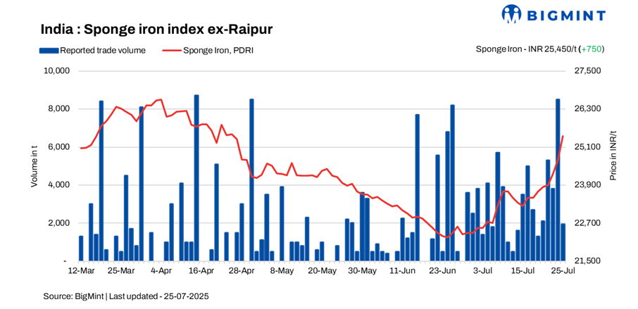 India’s sponge iron market registered a sharp upward movement on 25 July 2025, with spot prices increasing by INR 100-850/tonne (t) d-o-d across major regions. The price surge marks the highest level in the past three months, particularly in the Raipur market, driven by firm offers from producers and continued input cost inflation.