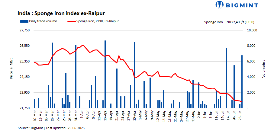 Transactions for approximately 25,650 t of sponge iron were recorded on Wednesday, compared to 13,750 t on 24 June. This notable rise reflects renewed buying interest and a marginal improvement in market sentiment. The increase in trade activity was observed in key regional markets such as Raipur, Raigarh, and Durgapur. Market participants in these regions responded to slightly firmer price offers, which were supported by a corresponding increase in demand.
