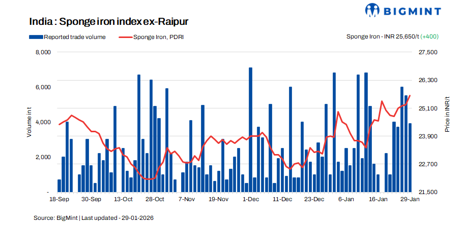 Sponge iron prices increased by INR 100–400/t d-o-d across key regions on 29 January. Despite the price hike, buying activity remained moderate, as higher price levels led to some slowdown in fresh purchases. Market participants noted that buying had been healthy over the past few sessions, enabling buyers to secure material earlier; consequently, they adopted a wait-and-watch approach, holding back on further bookings while seeking clearer market direction.