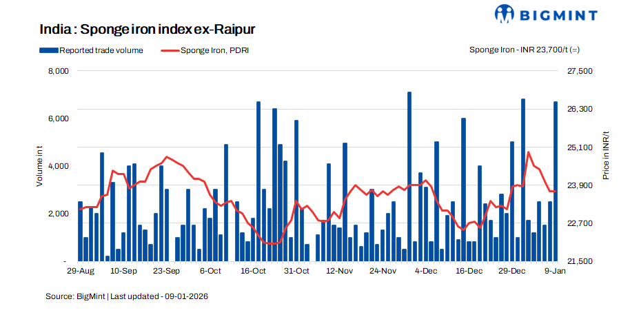 Indian sponge iron (DRI) prices witnessed a rebound on 9 January, supported by improved regional demand across key producing hubs. Overall market sentiment turned positive as buyers stepped up enquiries following price revisions in the market. After a continuous price correction over the past week, prices appeared to stabilise and rebound, encouraging active participation from buyers.