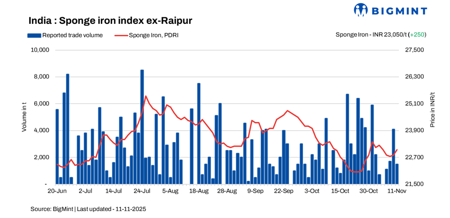 Sponge iron prices across India increased by INR 100-400/tonne (t) d-o-d on 11 November 2025, reflecting improved sentiment and firmer offers from producers in key markets. The sharpest rise of INR 300/t was recorded in the Raigarh region, supported by slightly improved buying interest from nearby billet manufacturers and firming raw material prices.