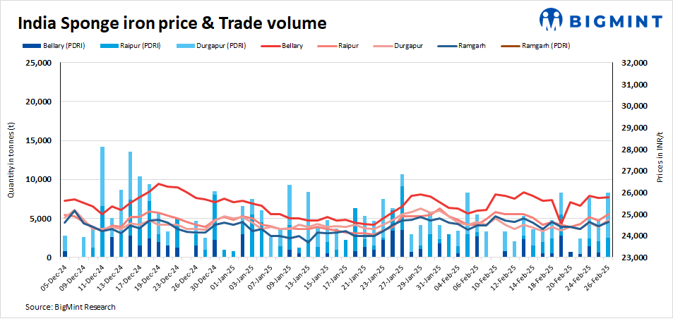 Transactions of about 14,000 t of sponge iron were recorded in the country on 26 February, up significantly from 9,700 t on 25 February.