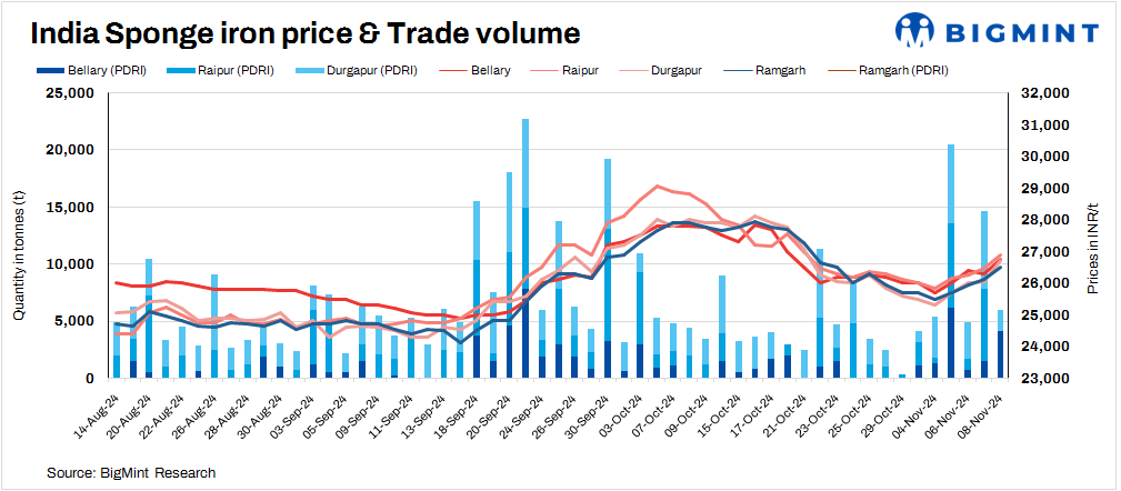 Transactions of about 10,600 t of sponge iron were recorded in the country on 8 November 2024, compared to 25,300 t on 7 November.