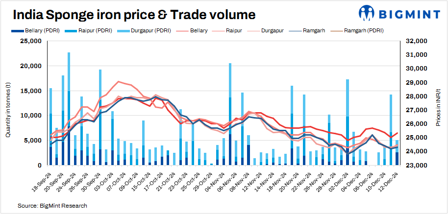 Transactions of approximately 6,520 t of sponge iron were recorded on Thursday, compared to 23,200 t on 11 December.