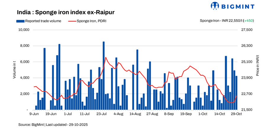 India’s sponge iron market witnessed a strong upward movement on 29 October 2025, with prices rising by INR 100-500/tonne (t) across key producing regions. The sharpest gains were recorded in Raigarh and Durgapur, where prices surged by INR 500/t, while Hyderabad and Chennai witnessed minor declines of INR 100/t due to sluggish demand and weather disruptions in the southern markets.