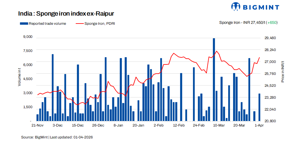 India’s sponge iron prices increased by INR 200-950/t d-o-d across regions on 1 April 2026, reflecting positive market momentum. Demand was moderately strong, though buyers largely made need-based purchases. Market sentiment was stable, as participants continued to engage cautiously while keeping a close watch on further price trends.