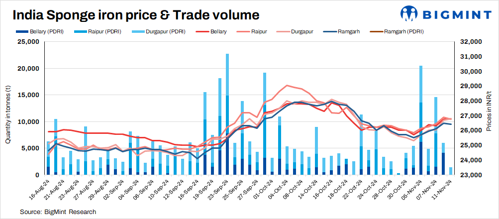 Approximately 1,400 t of sponge iron transactions were recorded in India on Monday, drastically down from 10,600 t on 8 November.
