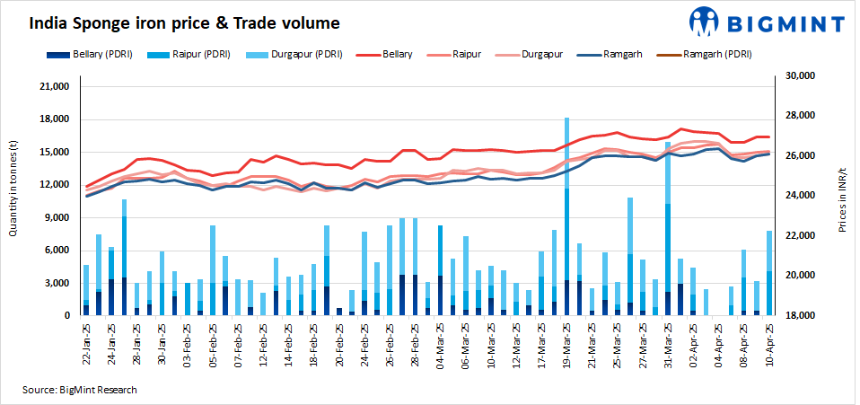 Transaction volumes increased d-o-d.Approximately 15,000 t of sponge iron transactions were recorded in the country on Thursday, up from 5,000 t on 9 April.