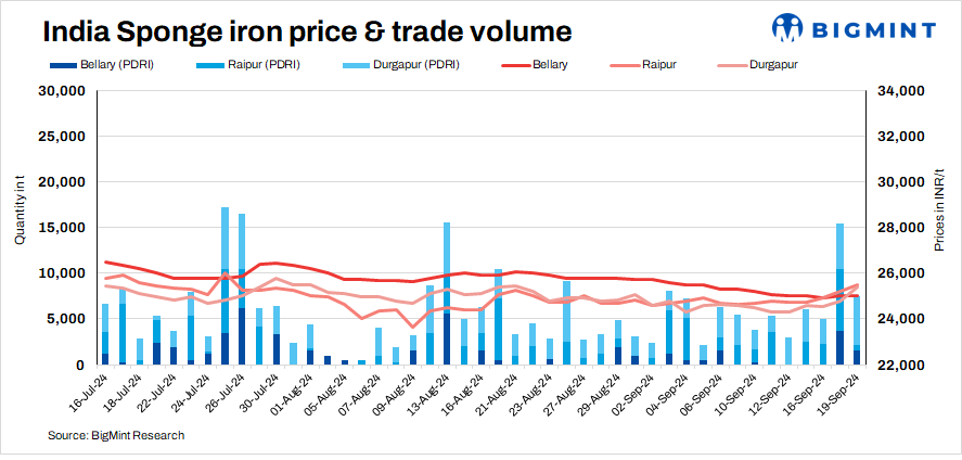 Transactions of about 26,700 t of sponge iron were recorded in the country, compared to 11,300 t on 19 September.