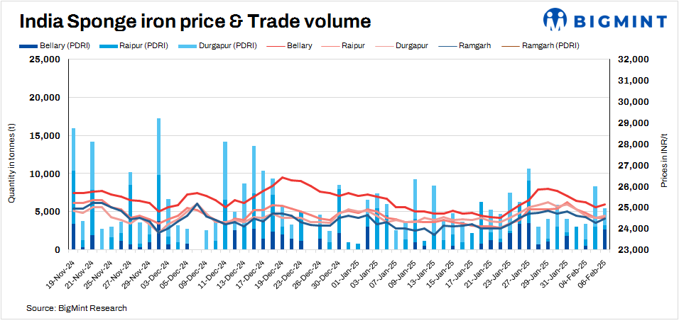 Pellet-based sponge iron (PDRI) prices were assessed at INR 23,800-26,000/t at close of trading today, while iron ore lump-based material (CDRI) stood at INR 25,700-30,400/t.
