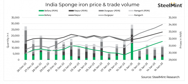 With producers quoting higher, sponge iron prices in India increased by INR 300–500/t in key locations on 16 January, 2023. The rise in raw materials prices was the key factor driving sponge prices. SteelMint understands that despite the positive outlook, sponge iron demand remained modest today as buyers resisted high offers, which ultimately led to limited spot trade volumes across domestic markets.
