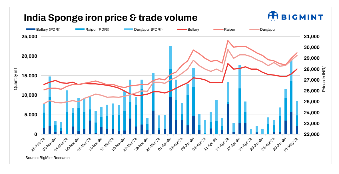 About 16,400 tonnes (t) of sponge iron transactions were recorded in the country on Wednesday compared to 30,875 t on 30 April.