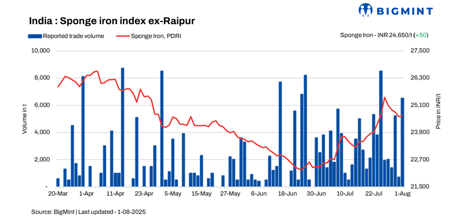 India’s sponge iron market opened the month of August with a modest upward price movement, as spot offers increased by INR 50-150/tonne across major producing regions. The Bellary region, however, witnessed a price dip of INR 100/t in lumps-based DRI, owing to regional oversupply and limited demand.