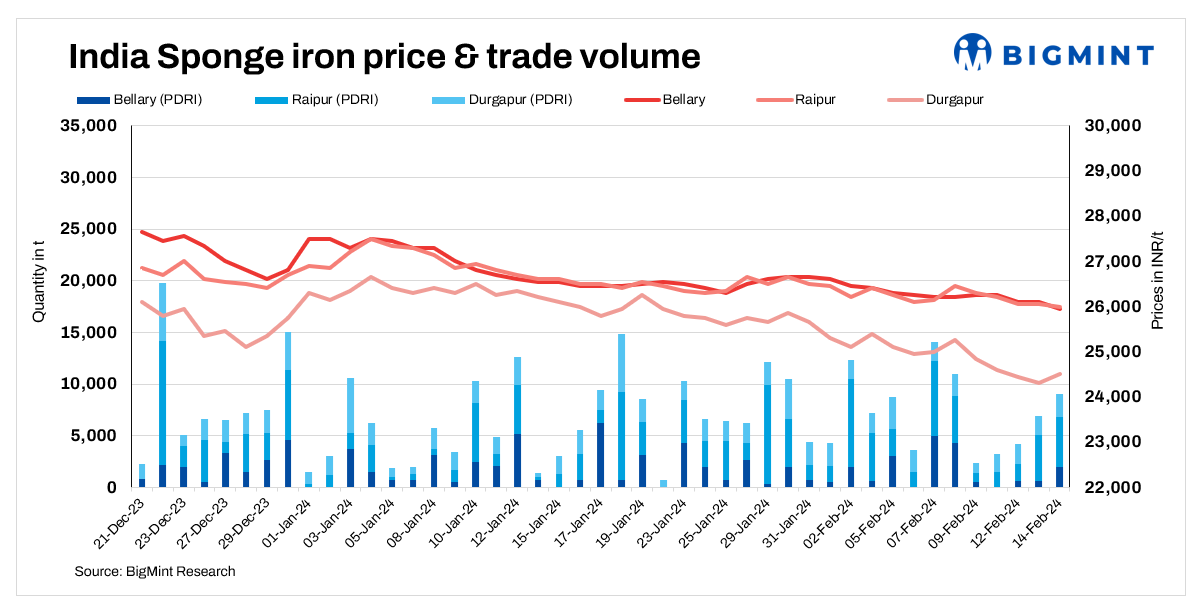 Sponge iron prices in some key locations in India increased by INR 100-200/t on 14 February, 2024. However, prices in Raipur and Bellary witnessed a slight drop by INR 50-150/t.